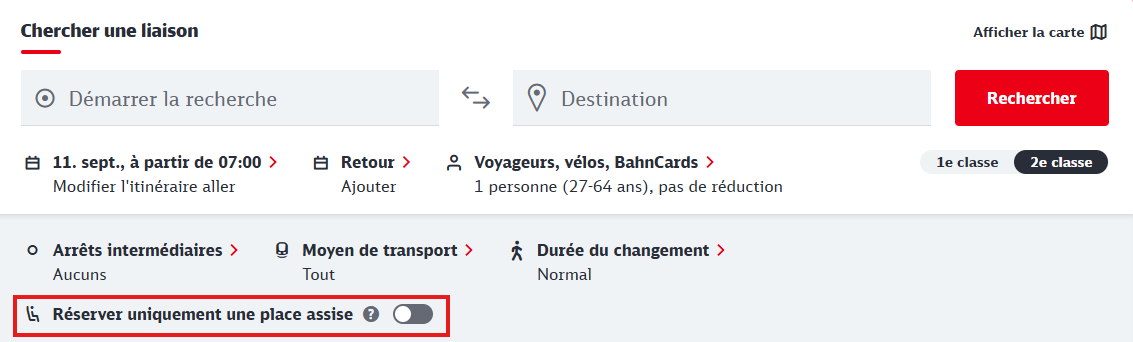 Pour réserver uniquement une place, il faut rechercher une liaison sur le trajet souhaité via le planificateur de voyage, puis sélectionner l’option Réservation uniquement.